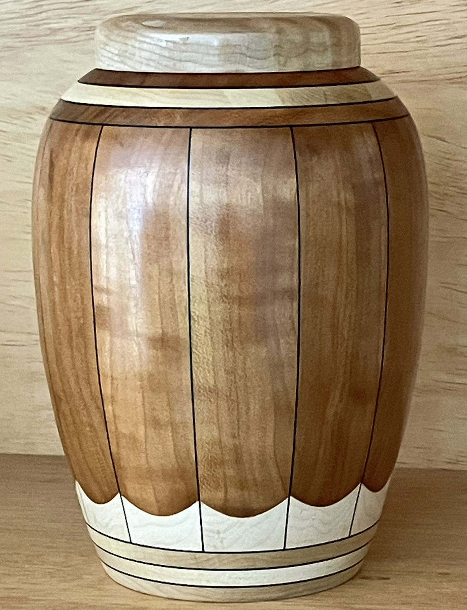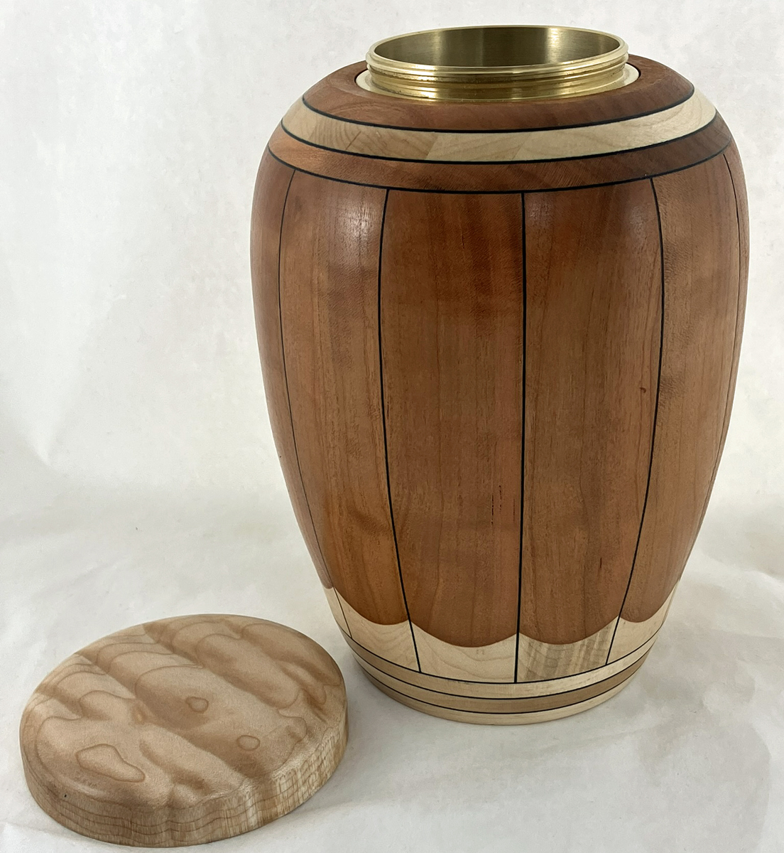 The urn is fashioned from cherry and quilted maple accented with dyed black veneer. The screw-on lid is turned from a solid piece of highly figured maple. The top and bottom of the urn contain concentric rings of cherry and quilted maple, and the lower portion features a scalloped accent. The urn is finished with multiple coats of durable gloss polyurethane.