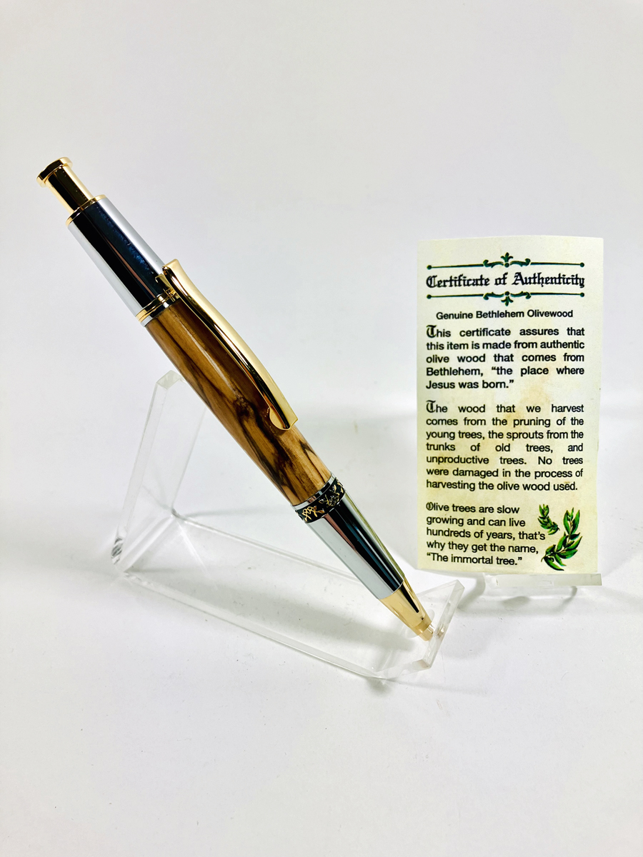 This 10k gold and chrome plated Aero click pen is turned from authentic Bethlehem Olivewood from the Holy Land. It uses a Parker-style refill and comes in an attractive presentation box. The pen also comes with a certificate of authenticity documenting the origin of the olivewood.
